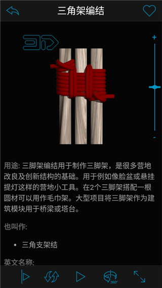 Knots 3D ios版是火遍全球70多个国家和地区的一款绳结学习应用程序,又名3d绳结,通过可以用它使用3D视图多角度观看和学习各种绳结的打法,并熟练运用在生活中,可支持中文、丹麦语、荷兰语、英语、法语、德语、希伯来语、日语等本地化语言,根据类别、类型、收藏等分类帮助用户随时查看自己想要学习的绳结教程。同时很多第一次用它的朋友都将被其实用的功能吓一跳,无论是360度旋转绳结、3D视图,还是放大绳结观察细节等在这里都可以满足你,因此被全世界的园艺师、渔民、消防员、登山者、军人和童子军所喜爱并推荐。