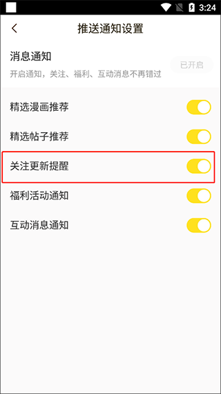 5、点击关注漫画更新提醒的选项后方的开关。