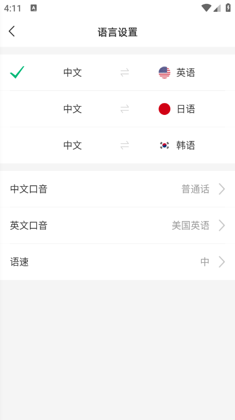 2、然后你就会进入语言设置,在这里除了设置语言,还可以设置口音,用户可根据需球进行调节。