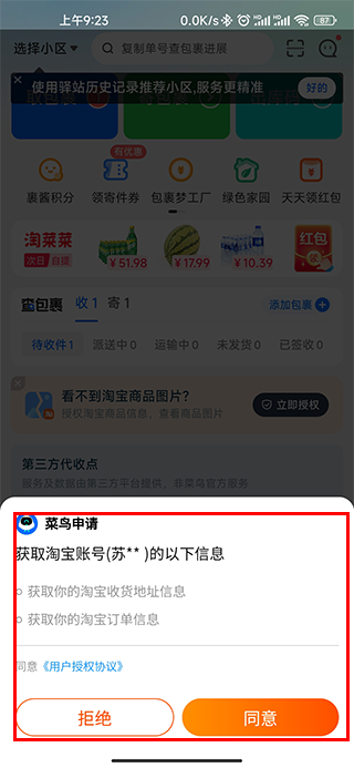 1、一般的菜鸟裹裹可以查看到自己在网上买的物件的快递信息,登录授权淘宝;