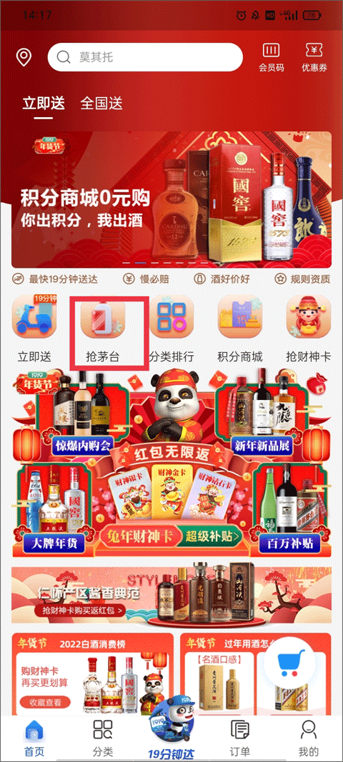 1、打开软件并进入【首页】,首页的主要功能分为:立即送、抢茅台、分类排行、积分商城、抢财神卡,选择“抢茅台”。