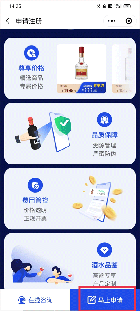 4、了解企业入驻有什么权益,像尊享价格、品质保障、费用管控以及酒水品鉴等,点击“马上申请”。