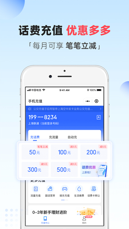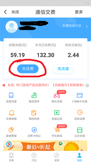 手机话费充值、流量充值、固话缴费、宽带缴费等。