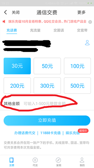 3、在“充话费”页面,“其他金额”处输入想要充值的金额(可以在首页我的账户余额中确认返利及余额),然后点击“立即充值”。