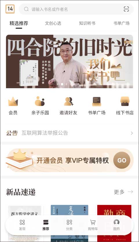2、推荐板块功能就非常多了,其中分为了精选推荐、文创心选、只是听书以及书单广场,精选推荐提供了非常有用的书籍,用户还可以用手机里的兑换卡来获自己喜欢的图书;文创心选这里就有很多非常好玩的好物推荐,像茶杯、扇子或定制文创等。