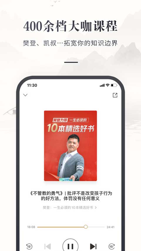 4、汇聚樊登、凯叔、一刻talks等400余档音视频课程,好课不贵,大咖云集;