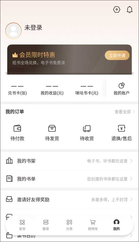 4、我的就主要呈现了个人信息界面,用户就是在这个界面中查看自己加入书架中的书籍,下单购买想要获得的图书、以及会员的订阅和退订等都是在这里操作。