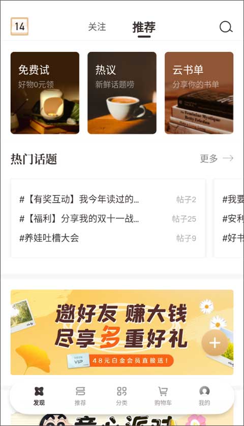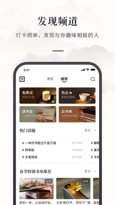 1、发现板块主要分为了关注和推荐两个小板块,用户可以关注书店、其他用户或者活动等,如果对某个用户或书店特别喜欢的话还能设置成特别关注。推荐包含热门话题、书单和其他用户的日常分享话题。