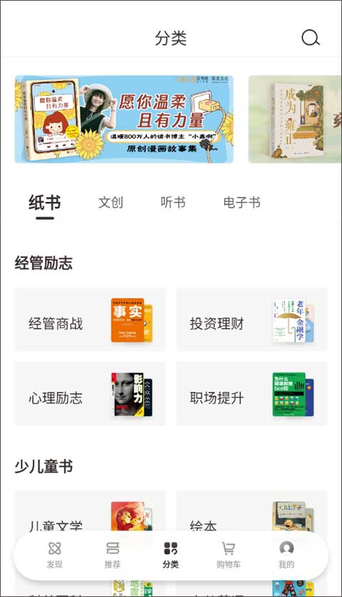 3、分类简单来说就是将图书按照相似点来进行划分区域,包含了经管励志、少儿童书、人文社科、文学小说等。
