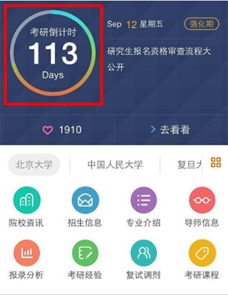 1、点击“考研倒计时”进入“考研日历”界面,贴心的考研倒计时、标示当前的考研阶,每天为你播报最新最热的帖子和资讯,每天为你提供生活小贴士,让你考研生活井井有条,每天为你提供正能量场,为你考研鼓劲加油。