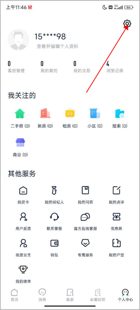 1、下载安装好链家ios版本,进入软件首页,点击个人中心,找到右上方的设置并点击。