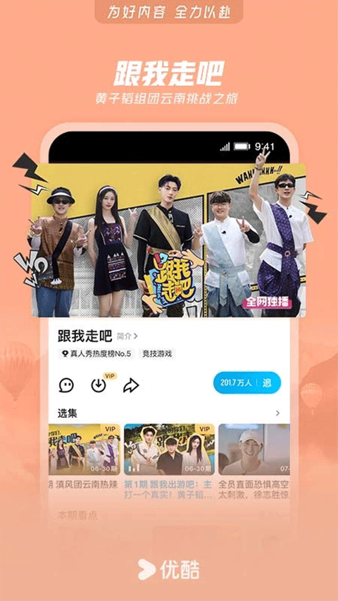 优酷视频苹果版是阿里巴巴旗下的手机视频软件,涵盖了大量影视内容,四大头部内容矩阵由剧集、综艺、电影、动漫组成和资讯、纪实、文化财经、时尚生活、音乐、体育、游戏、自频道八大垂直内容群构成,新片更是覆盖了80%,并提供VR、直播、会员、家庭娱乐和经纪等业务。无论是业余或专业,无论个人或组织,以微视频形式呈现的视频收藏、自创与分享优酷都是非常欢迎的。全新的优酷视频第一时间搜罗全网最热门的视频,以搜索排名的形式查看各分类第一,使用者可根据喜欢选择榜单,对节目一目了然。还为用户开设了专属私人空间,拥有我的视频、我的播放列表、我的订阅、我的收藏、我的PK擂台、我的俱乐部、和我的好友等群组功能,精彩视频看完了,还可以到社区交流,通过影视拓展人脉网络,和自己有一样兴趣的朋友互动,其乐融融。