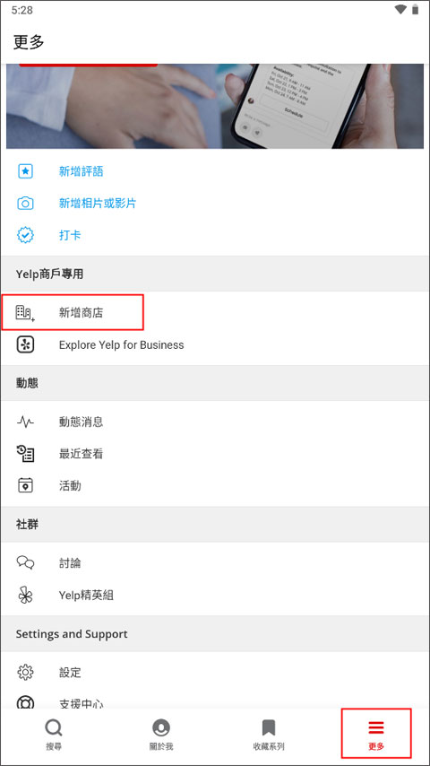 1、打开app默认进入到“搜寻”板块,点击切换到【更多】页面,找到Yelp商户专用中的“新增商店”。