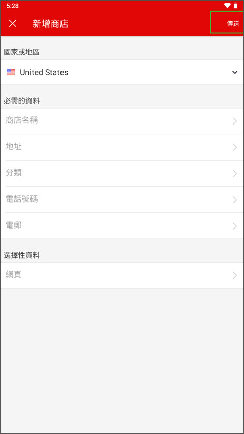 3、下面就是填写商店的资料信息了,输入商店名称、地址、分类、电话号码等,最后点击右上角的传送按钮即可新增成功。