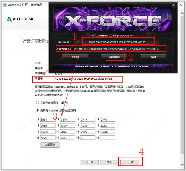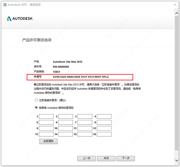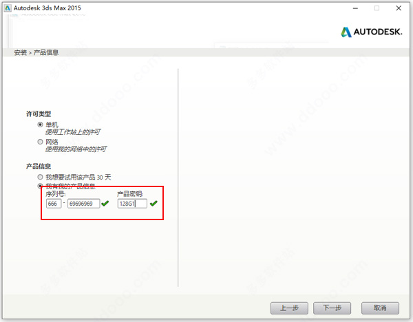 3、产品密码为:Autodesk 3ds Max 2015:128G1