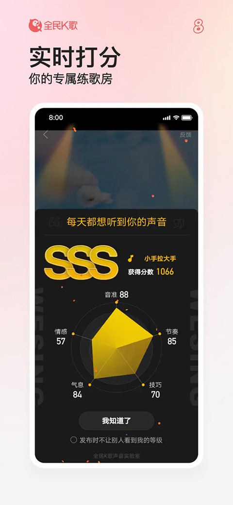 软件还特别照顾某些唱技不好的小伙伴们,给这些小伙伴提供了很多音质特效功能,通过这些音质特效可以让小伙伴的唱功瞬间拉高一个层级,分分钟就能营造出一种歌神的感觉。同时全民k歌也作为一款交友软件,在基于对音乐爱好者的深层次聚合下,全力打造了一套围绕音乐的社交生态,用户不仅可以在平台上以歌会友,与身边熟悉或不熟悉的爱好音乐的人一起K歌,一起互相了解,而且还能够认识到很多有一定音乐素养的人士,甚至还可以遇见明星歌星,与他们同框歌唱。最后全民k歌还有一定的直播属性,大量的有歌唱表演才华的人可以在这里成为一名优秀主播,通过平台来获得一定人气和热度,并且还可以为观众带来不一样的全民文化盛宴。