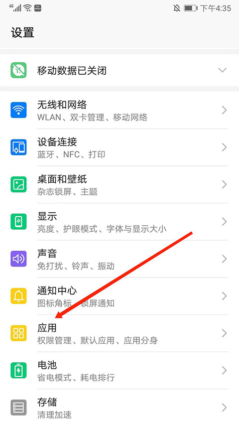 1、点击进入设置。进入系统设置界面,点击【应用】。