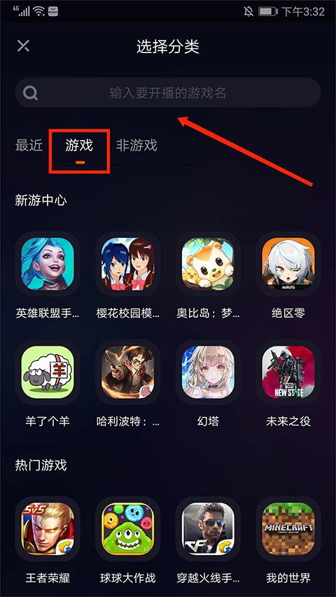 2、进入选择分类界面,选择“游戏”栏目,可在上方“搜索框”搜索,或者在下方列表中选择要直播的游戏,