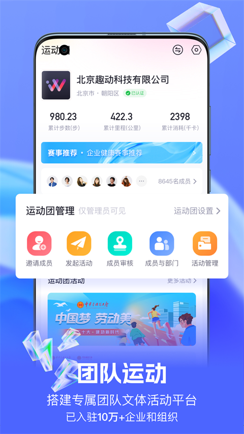 企业专属运动团,为企业活动组织者提供便捷的手机移动端管理,丰富有趣的多类型活动玩法,全方位运动数据统计,为企业提供一站式职工全运动解决方案。