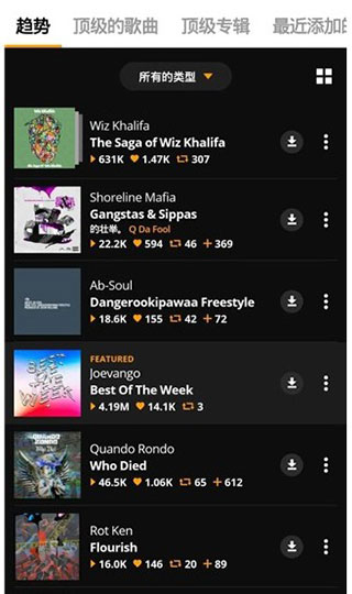 1、在本站下载打开软件,看到有几个主要栏目,其中包括趋势,顶级的歌曲,顶级专辑等;