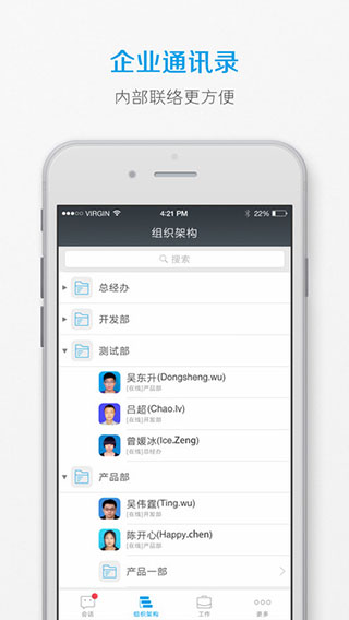 – 组织架构,把企业通讯录装在手机里,找人更容易