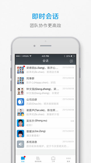 – 支持微信企业号会话服务,与微信消息打通,自由选择工作生活是否分开