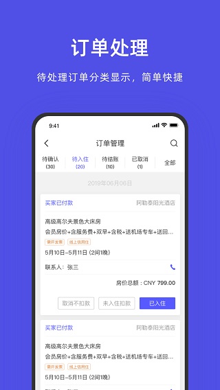 飞猪酒店商家版是专注于商家而开发的一款移动端应用管理工具,该软件能够帮助用户轻松的去管理酒店,在处理订单方面更加的便捷,同时包括了管理价格、掌控房态、处理评论,美化图片等功能,所谓是样样精通,是你手中不错的管理工具。除此之外,该软件还提供了多员工管理,让商家可以随时随地的查看各员工的工作状态,且收款提供备注,方便好记,并且还支持支付宝收款、多员工收款、交易查询、蓝牙打印等功能,需要的用户不妨来下载体验吧。
