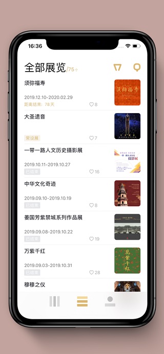 1、展讯功能:主要包含所有展览展览的展示,其中包括推荐展览、正在展览、即将开展,以及历史展览等功能模块,主要是对展览进行分类让用户能准确的找到想要关注的展览进行收藏与分享。