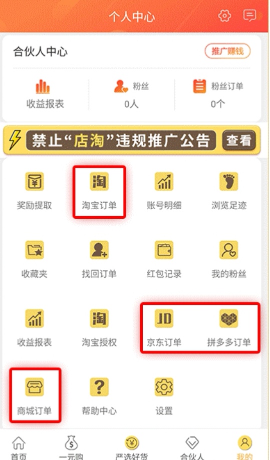 1、点击APP右下角“我的”进入个人中心页面,直接点击对应的平台订单即可查询!