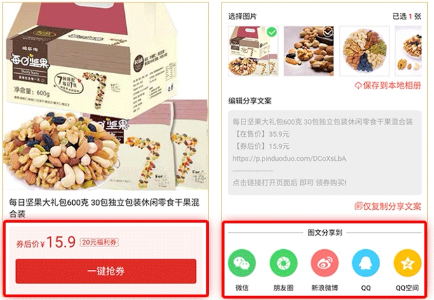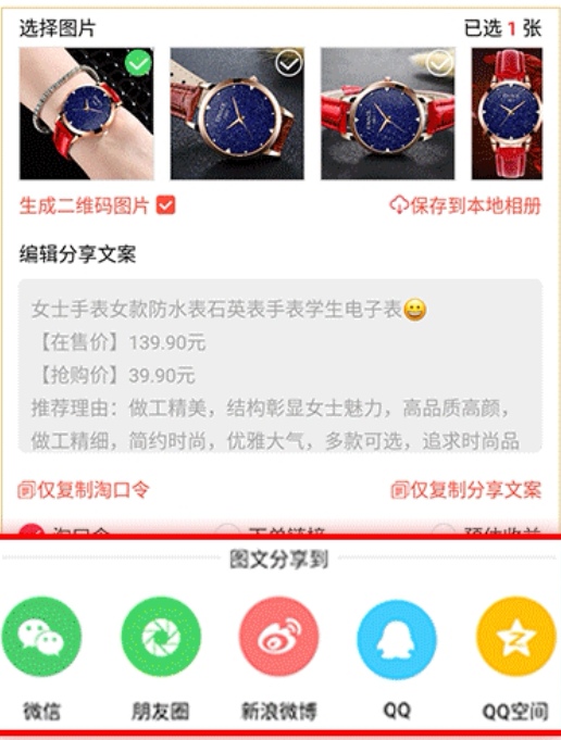 3、可以任意选择图片的张数,点击下方任意渠道均可分享商品,文案会自动复制,图片发送后直接长按粘贴发送文案即可