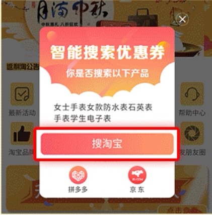 2、打开APP会弹出一个智能搜索框,可以搜索淘宝,京东,拼多多,那我们复制的淘宝/天猫的商品我们就点击“搜淘宝”