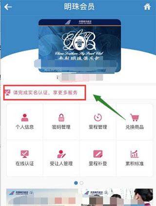 5、在明珠会员界面,点击中间的请完成实名认证,享更多的服务,如下图所示;