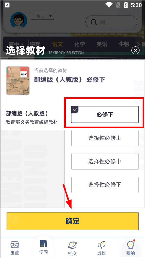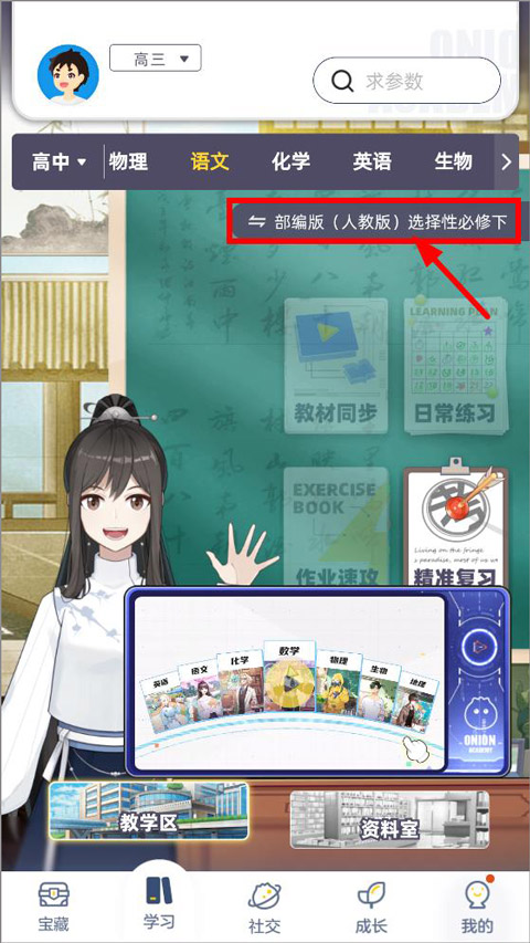 4、点击学习页面中右侧的教材选择,下拉出现科目各版本教材,用户根据自己所在省份和学校教材进行同步即可。