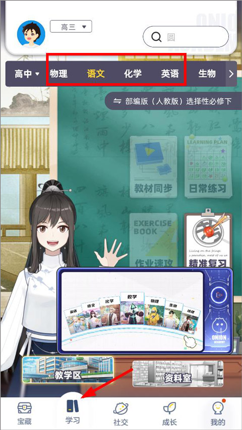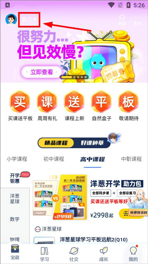 1、打开洋葱学园学生版软件,登录进入宝藏首页,用户可在首页查看各年级课程(小学、初中、高中、中职等),点击左上角头像;