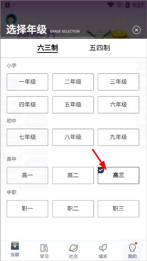 2、打开选择年级页面,用户根据自己的学制和年级点击选择;