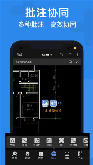 开启编辑模式,即可绘制直线、框选复制、粘贴、删除,插入多行文本等;双击文字和标注可快速修改文字。