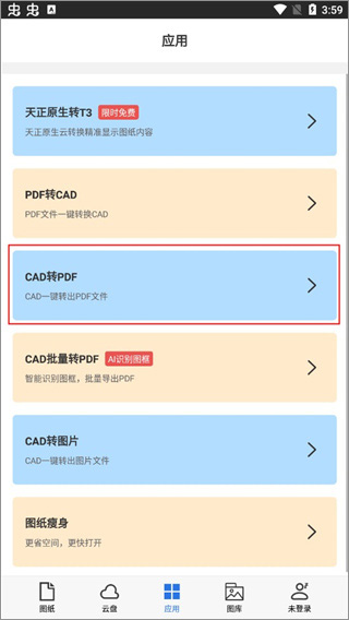 4、选择要转换的格式,目前支持天正原生转T3、PDF转CAD、CAD转PDF、CAD转图片、图纸瘦身。这里小编选择的是【CAD转PDF】