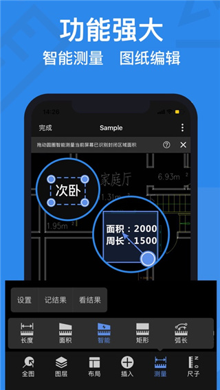 3、支持图纸平移、缩放、全图、放大镜、布局空间、图层、智能测距;