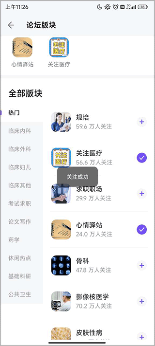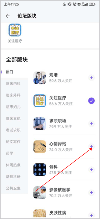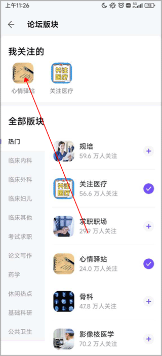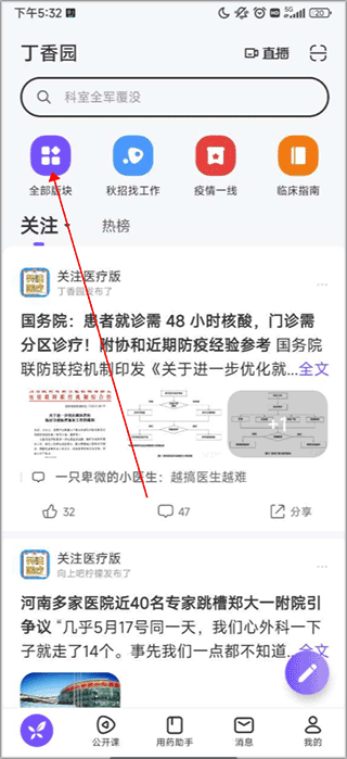1、打开丁香园ios版,默认进入“版块”页签,点击“我关注的”下面的“全部版块”