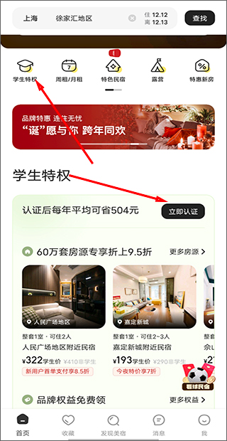 1、打开美团民宿ios版,在首页下滑找到“学生特权”,点击“认证”;