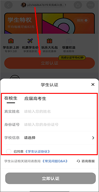 2、然后跳转到学生特权页面,点击“立即认证”输入自己的真实信息即可完成学生认证;
