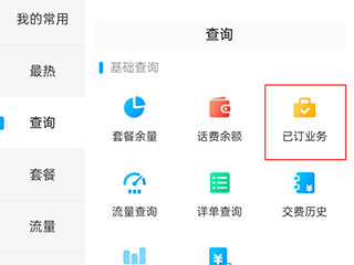 1、登录海南移动网上营业厅app,点击分类,点击查询,点击已订业务。