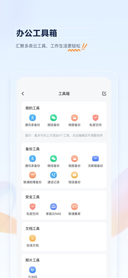 联通云盘苹果版是一款基于5G网络为满足用户海量数据提供的存储工具,虽说现在的苹果手机更新迭代,本地存储空间也在不断加码,但对于拥有庞大数据需求量的用户,依旧要借助云存储的工具来保障之前的数据、相册等文件能够继续使用!相比于其他网盘云存储软件,联通云盘面向的对为个人及家庭用户,支持个人云、家庭云、微信/通讯录/相册备份;支持多端文件共享等云存储服务,旨在为用户带来更极速,更安全,更智慧的全场景融合云存储体验!