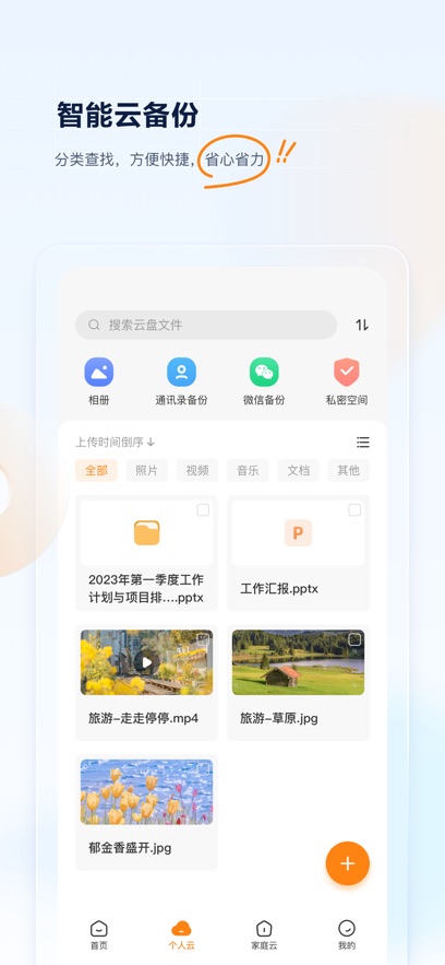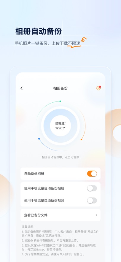 支持手机相册、视频自动备份,支持微信文件备份,支持通讯录备份;