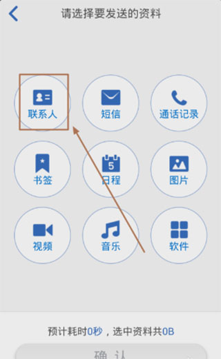2、然后选择相应的文件类型,再选择搜索到的新手机,等候片刻,即可完成传输。
