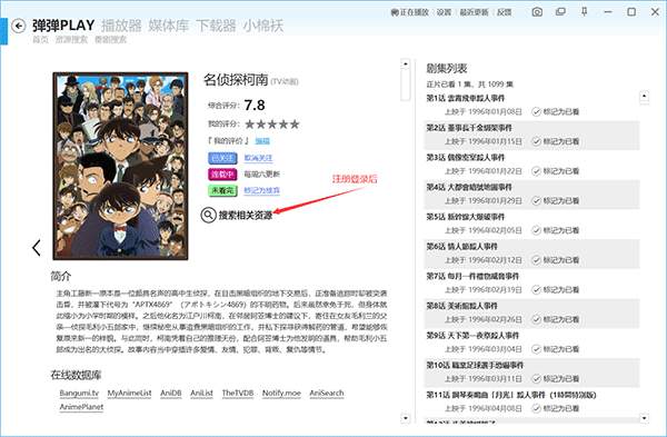 1、弹弹Play的首页就是番剧时间表,因为它毕竟主打看番功能,点开就到了详情页面,这里可以标记观看进度,还能一键搜索相关资源(注册登录后)
