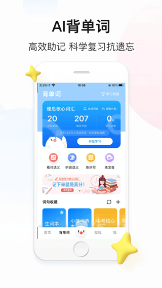 – 背单词:教、学、测、三位一体的背词模式,支持按同根词、考频、易错词、随机乱序等多种背词顺序,重点单词优先背。
