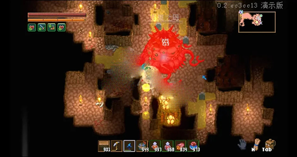 仔细观察地面,有五个会释放小怪的虫洞,拿虫巢墙壁将它围住。虫巢墙壁就在周围,用炸药炸两三次就能破坏。即使用目前最好的铁镐也得挖很久,耗损太大,不推荐。