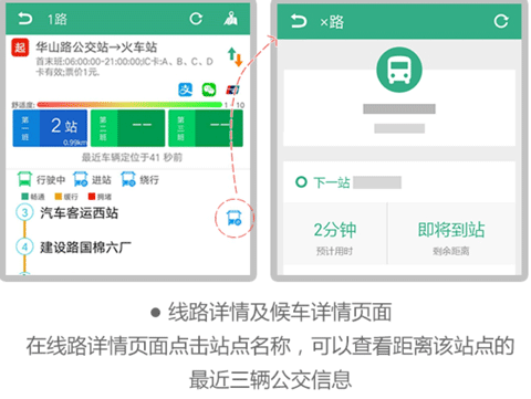 4、“车内舒适度”提示:候车界面车辆位置信息、车辆预到站时间一应俱全,更有全国首创“车内舒适度”提示,依据车内客流统计设备换算出车内舒适度指数,用红、黄、绿不同颜色显示,方便市民选择出行车辆。