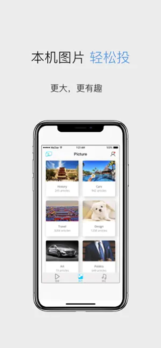 -本地文件投射:支持将手机中的照片,音乐和视频投影到大屏幕上,使客厅中的大屏募电视成为家庭共享中心,与家人和朋友共享幸福!
